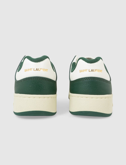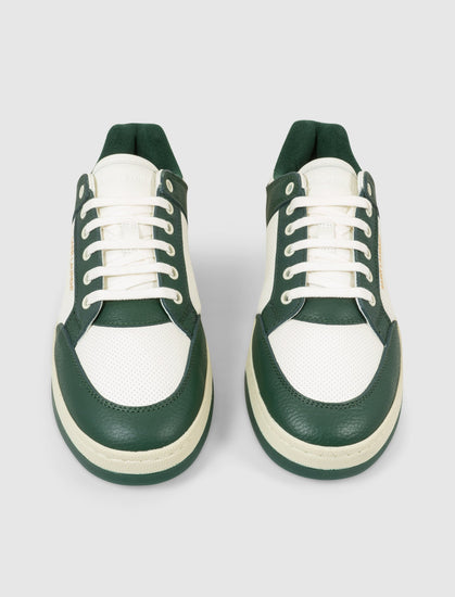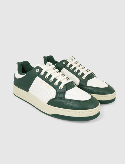 Low top sneakers. Leather overlays around the toe, eyelet panels, and heel counter. Perforated leather toe box, and side panels. Leather collar. Front lacing. Stamped logos below the outer eyelet panel, and on the heel. Rubber midsole. Rubber outsole.