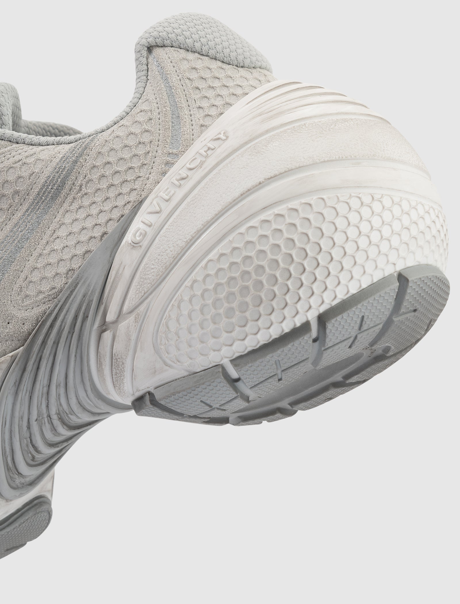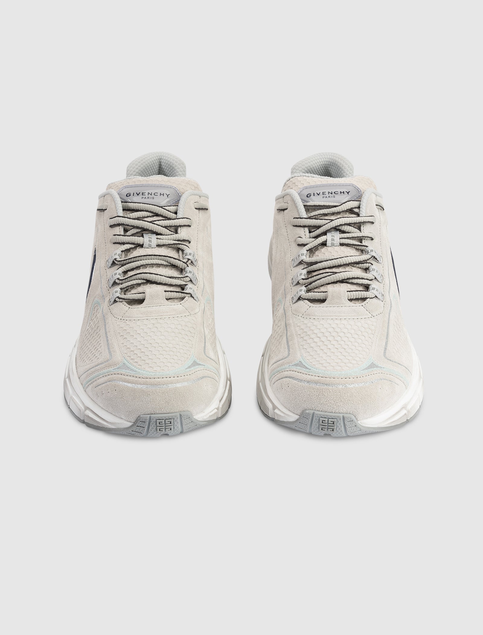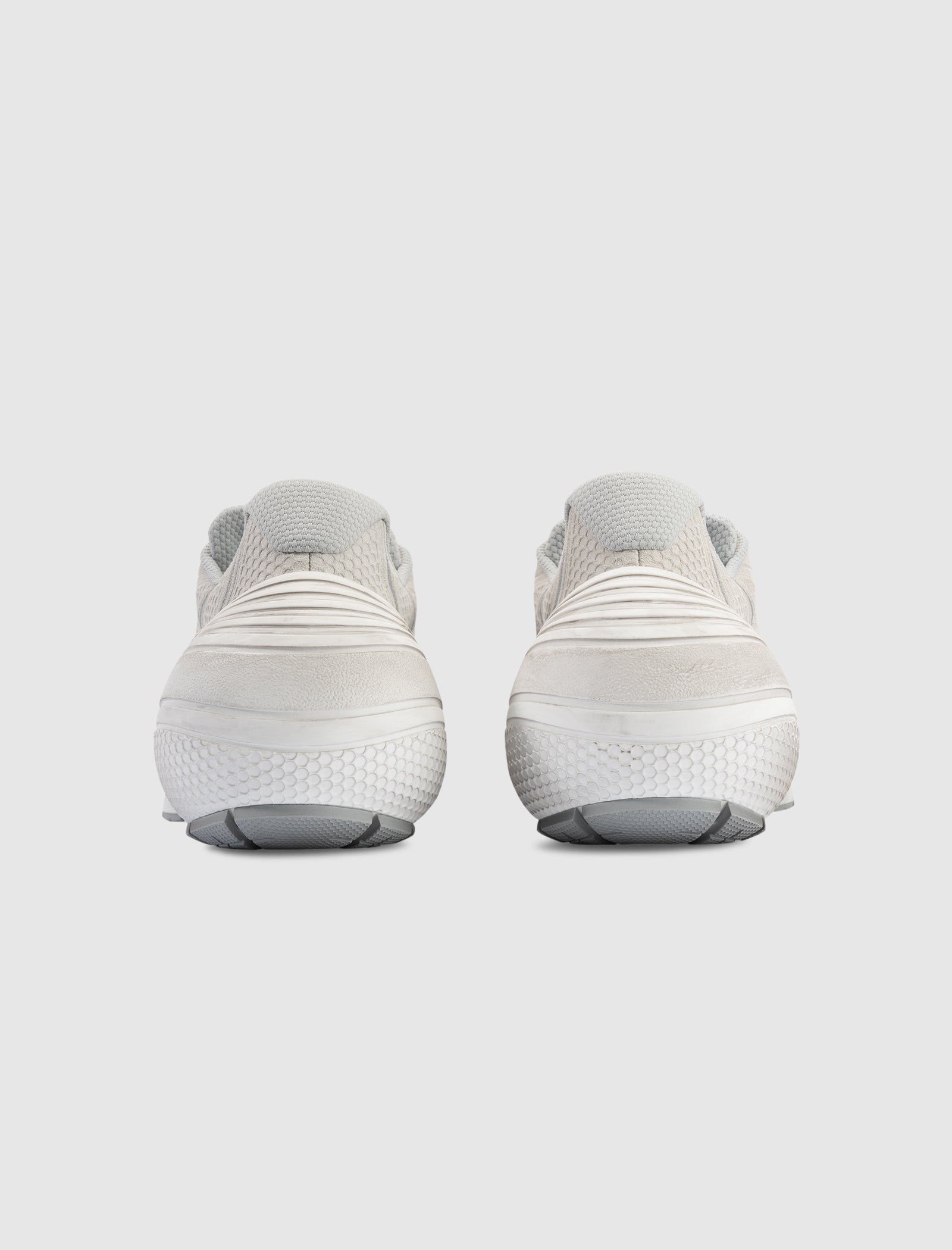 Low top sneakers. Stamped suede upper. Suede overlays around the toe, eyelet panels, and side panels. Front lacing. Jacquard nylon tape lace loops. Stamped suede tongue. Bulbous rubber heel counter. Rubber midsole. Rubber outsole.