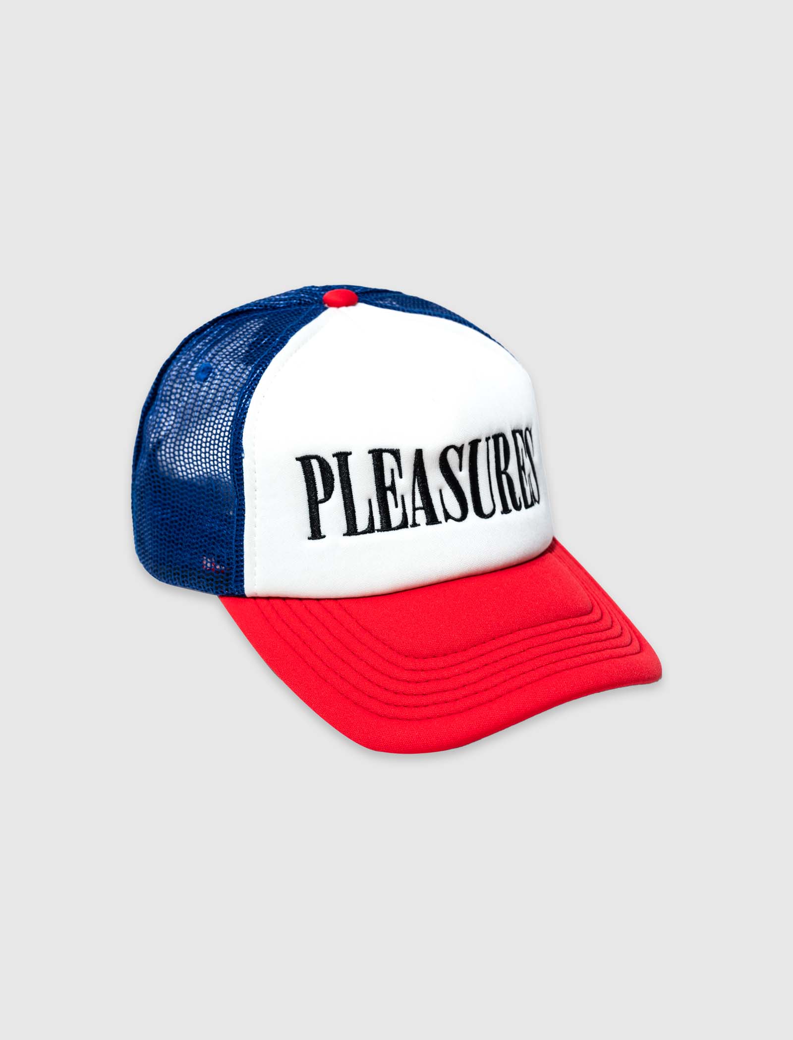 Trucker hat. Neoprene front panel. Embroidered logo on the front. Curved brim. Mesh back panel. Snap back closure.